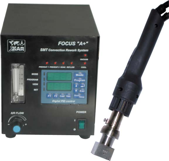 FOCUS A+, the newest system in the industry, offers total process control and best performance among convection Rework/Repair Tools. As the only system in its class can pre-program both top and bottom heating in individual zones. It is simple and easy to use. It has five time/temperature zones to accommodate lead-free solder profiling requirements (four heating and one cooling zone). When used in conjunction with X-1001 Series Pre-hearers or SMT-ServiCE Rework units offers 10-zone control 5 top and 5-bottom temperature settings during the rework process. For someone who really wants to bring the rework to a science, the unit has an extra mode to work in 10 zones (control the temperature rise in each of the 5 zones and maintain the reached temperature for preprogrammed period of time).