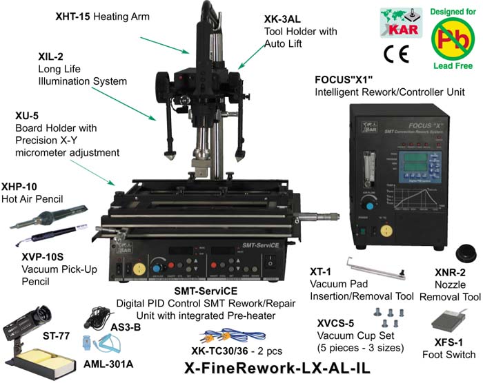 X-FineRework-LX is a Unique, Modular Digital PID Control SMT Rework/Repair System with a Pre-heater. This new generation system offers precise and accurate monitoring of process temperatures at a working point on a PCB. Also, allows pre-setting of exact temperature of air stream at the end of Hot Air Tool, Hot Air Pencil Nozzles and at a tip of Soldering Iron. Board Holder with X and Y micrometer adjustments and precision rotation stage allows fine alignment of a component with the corresponding land pattern on the board. The accuracy is achieved by a unique feature, user adjustable offset, which compensates for differences in PCBs' being reworked (dual or multi-layer, high and low mass) in case of pre-heater settings, and differences in tips or nozzles